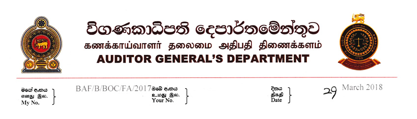 The audit of the Financial Statements of the Bank of Ceylon (“the Bank”) and the Consolidated Financial Statements of the Bank and its subsidiaries (“Group”) for the year ended 31 December 2017 comprising the Statement of Financial Position as at 31 December 2017 and the Statement of Profit and Loss, Statement of Comprehensive Income, Statement of Changes in Equity and Statement of Cash Flows for the year then ended, and a summary of significant accounting policies and other explanatory information was carried out under my direction in pursuance of provisions