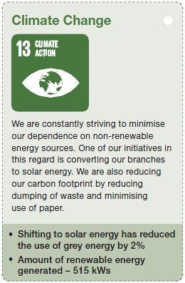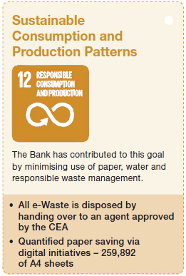 The Bank has a substantial direct resource consumption and environmental impact by way of electricity, air conditioning, water and paper. We seek to reduce our carbon footprint by minimising the impact through direct emission reductions by increasing fuel efficiencies in our vehicle fleet, careful maintenance of air conditioners etc., and indirect emission reductions by reducing use of non-renewable energy. This is implemented through our Green Banking Policy which was launched in 2016. As at end of the year 2017, total of 20 branches have converted to solar energy. The initiative has generated total 515 kWs of renewable energy which is 2% of our total energy consumption. Some of the other initiatives have been paper recycling, e-Waste management, use of non-toxic materials in construction, installing eco-friendly equipment and energy efficient lighting systems and maintaining green gardens with rain water harvesting systems. During the year a total of 16,930 kgs of waste paper were recycled.