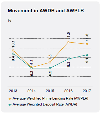 The Statutory Reserve Ratio (SRR) applicable to all rupee deposit liabilities of commercial banks was increased by 150 bsp to 7.5%, to be effective from the reserve week commencing 16 January 2016. On 24 March 2017, the Standing Deposit Facility Rate (SDFR) and the Standing Lending Facility Rate (SLFR) were increased by 25 bsp to 7.25% and 8.75% respectively. Meanwhile, the commercial banks’ lending and deposit rates remained on a similar base as that of last year, with little changes observed. The Average Weighted Fixed Deposit Rate (AWFDR) at end 2017 increased to 11.48% from 10.46% last year, while the Average Weighted Prime Lending Rate (AWPLR) increased to 11.55% from 11.52% last year. The Monthly Average Weighted Deposit Rate (AWDR) increased to 9.07% from 8.17% last year.