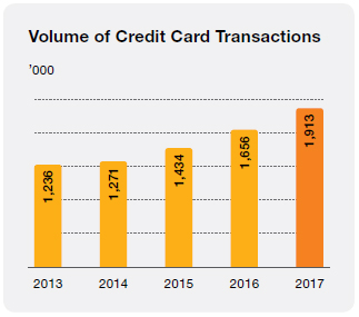 The Bank of Ceylon credit card is accepted at more than 6,000 outlets in Sri Lanka and 20 million merchants worldwide. The same applies to our debit card which has a dual functionality as an ATM card, and ensures prudent spending. A total of 15,684 credit cards and 883,939 debit cards were issued in 2017. During the year, the increase in total number of credit cards and debit cards were 12% and 18% respectively.