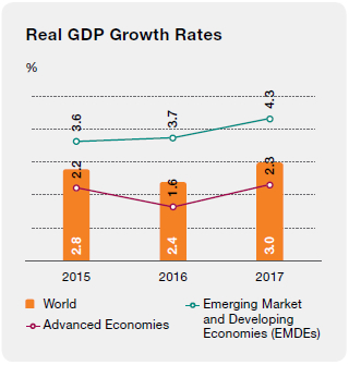 In 2017, the global economy recovered somewhat from its subdued performance in 2016. Growth is now estimated to have reached 3.0%, which is slightly higher than previous projections, It is heartening than countries accounting for more than three quarters of global GDP have seen an increased growth in 2017 compared with the previous year. There are positive signs of productivity recovering from the post-2008 crisis. The growth was mainly driven by Germany, Japan, South Korea, and the United States. Brazil, China, and South Africa also performed better than previously expected. In the last few months of the year, there was also a resurgence in global trade. Contributing factors were increasing investment in advanced economies and pick-up in manufacturing output in some Asian countries. Spare capacity is diminishing and is already practically zero in the US and several advanced economies. The unemployment rate too has returned to near pre-crisis levels in most advanced economies. Nevertheless core inflation remains low, which is a hangover of previous low commodity prices.