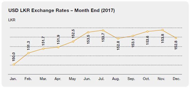 The Sri Lankan Rupee depreciated by 2% in 2017 YoY against the US Dollar. Outflows increased initially due to rising imports, debt service payments and foreigners divesting their investments in Government Securities. However, later the pressure on the currency was reduced due to net inflows to the Colombo Stock Exchange and revived investments in the Government Securities market. The currency depreciation was further eased by the receipt of the fourth tranche of the International Monetary Fund (IMF) Extended Fund Facility in December 2017, and the issuance of the International Sovereign Bond. The country’s credit ratings were favourably revised during the year. Fitch Ratings revised its rating from B+ negative to stable in February 2017 while the S&P rating was also upgraded from B+ negative to stable in November 2017.