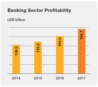 Although economic growth in general was lacklustre in 2017, the financial sector showed a robust performance accounting for 9% of the estimated GDP in 2017. The profits before tax of the banking sector reached LKR 194.7 billion in 2017 recording an impressive increase of 18% YoY over 2016.