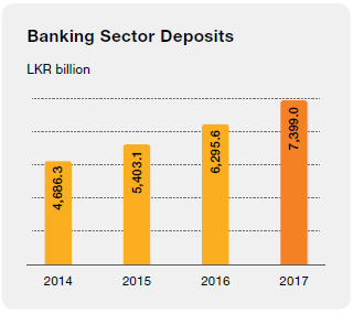 Although economic growth in general was lacklustre in 2017, the financial sector showed a robust performance accounting for 9% of the estimated GDP in 2017. The profits before tax of the banking sector reached LKR 194.7 billion in 2017 recording an impressive increase of 18% YoY over 2016. Net interest income increased by 12% over 2016, and notched LKR 341.6 billion. Total net assets, which were LKR 10.3 trillion as at end 2017 increased by 14% over a year before. In other respects too, the sector showed resilience with improvements in asset quality, capital and liquidity levels which were maintained well above statutory minimum levels. The prime source of funding was deposits which grew by 18% to LKR 7.4 trillion in 2017.Loans and advances grew by 16% during the year and reached LKR 6.4 trillion. The increase was across all economic sectors despite higher interest rates.